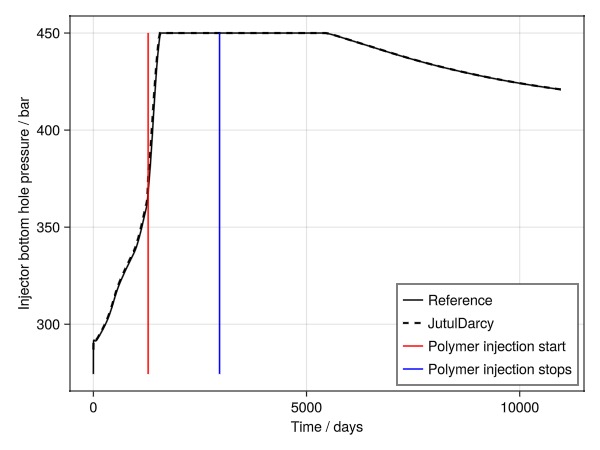 lines!(ax, [1285.0, 1285.0], [minimum([jutul; ref]), maximum([jutul; ref])], label = "Polymer injection start", color = :red)