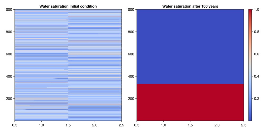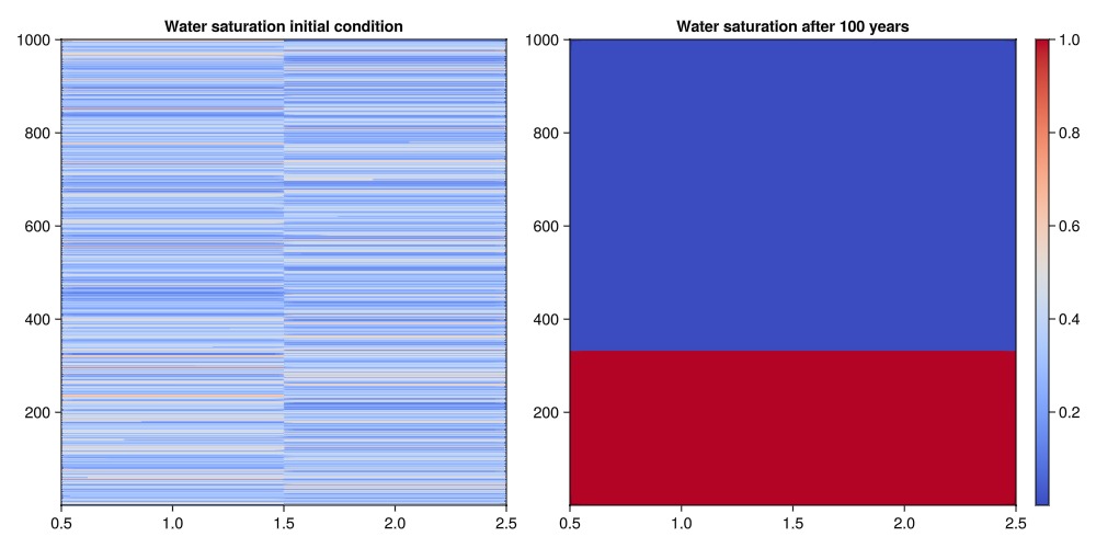 We will now plot the water saturation for the initial condition and the state after 100 years. We observe that the initially random water saturation migrates to the bottom of the model. This is expected, as the water is the heaviest phase. A similar observation could be made for the other two phases.