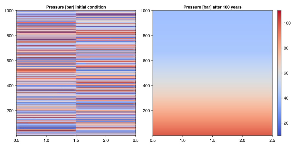 We observe that the initially constant pressure becomes a nearly linear function of depth after 100 years. This is the expected result for a model with constant and no driving forces other than gravity.