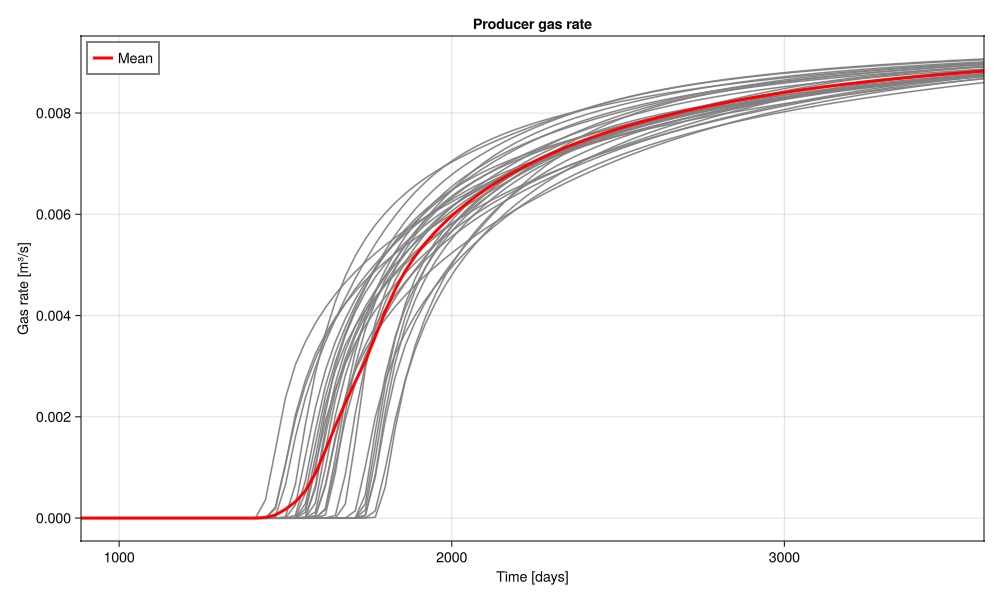 wells, saturations = simulate_porosities(porosities_uniform);Plot the gas rate at the producer over the ensemble