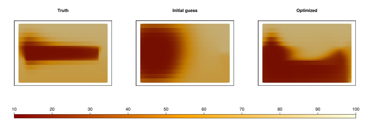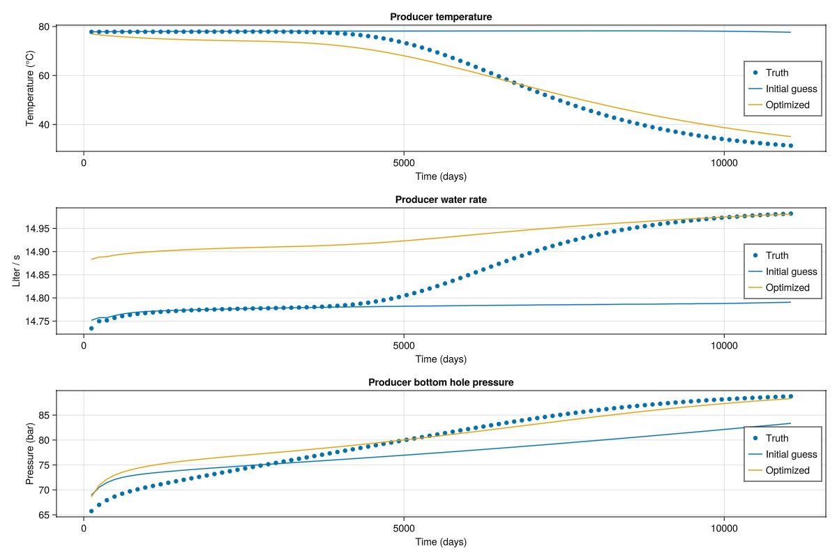 We plot the spatial results for the truth case, the initial guess, and the optimized case. The temperature is plotted in Celsius and we use the same color scale for all steps. Note that in terms of the optimizer itself, this is hidden data: The objective function only matches the well responses. Getting a good match in the spatial distribution of temperature is a side-effect of the physics and parametrization of the model, as different physics or a different parameterization could lead to good match in terms of the objective function, even without good match for the spatial distribution.