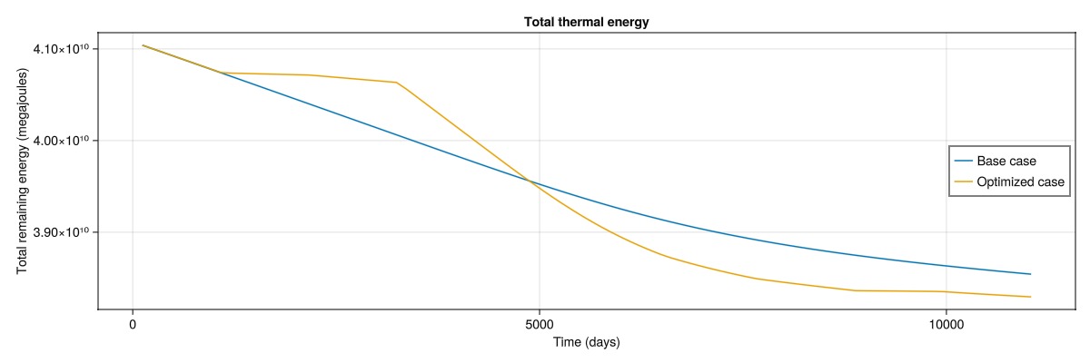 The total thermal energy in the reservoir is computed as the sum of the thermal energy in each cell, which is the result of the rock heat capacity, porosity, fluid heat capacity and the temperature in each cell. The optimized strategy significantly decreases the remaining thermal energy in the reservoir, while still producing less cost than the base case according to our objective. The 2D nature of this problem makes it easy to recover a large amount energy, as the majority of the cells are swept by the cold front.