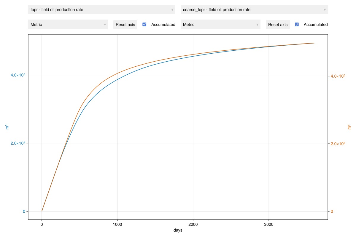 plot_reservoir_measurables(m, left = :fopr, right = :coarse_fopr, accumulated = true)