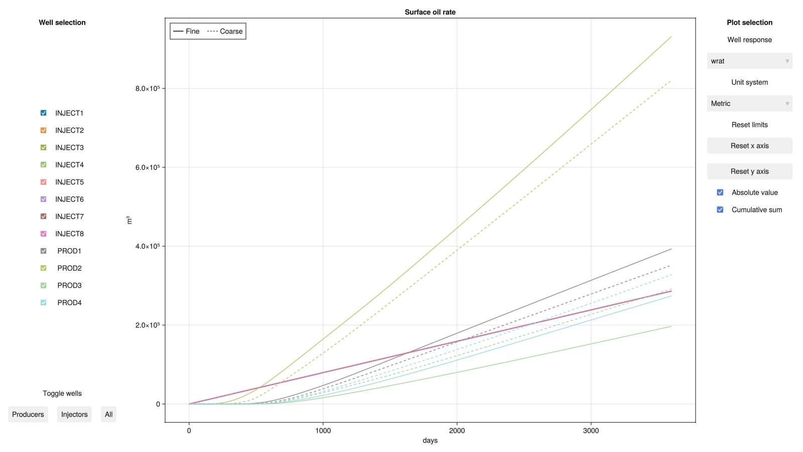 plot_well_results([ws, ws_c], names = ["Fine", "Coarse"], field = :orat, accumulated = true)