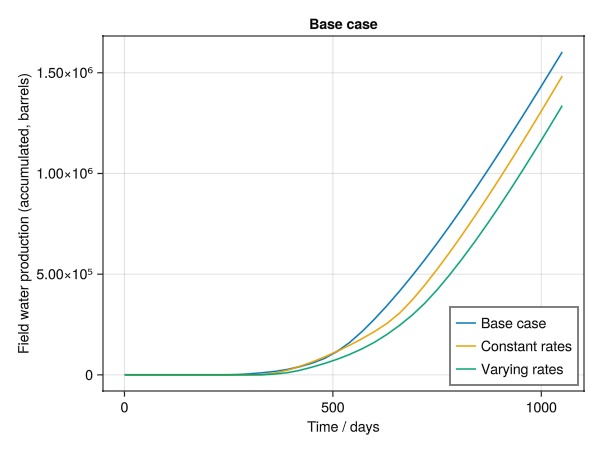 ax = Axis(fig[1, 1], xlabel = "Time / days", ylabel = "Field water production (accumulated, barrels)", title = "Base case")