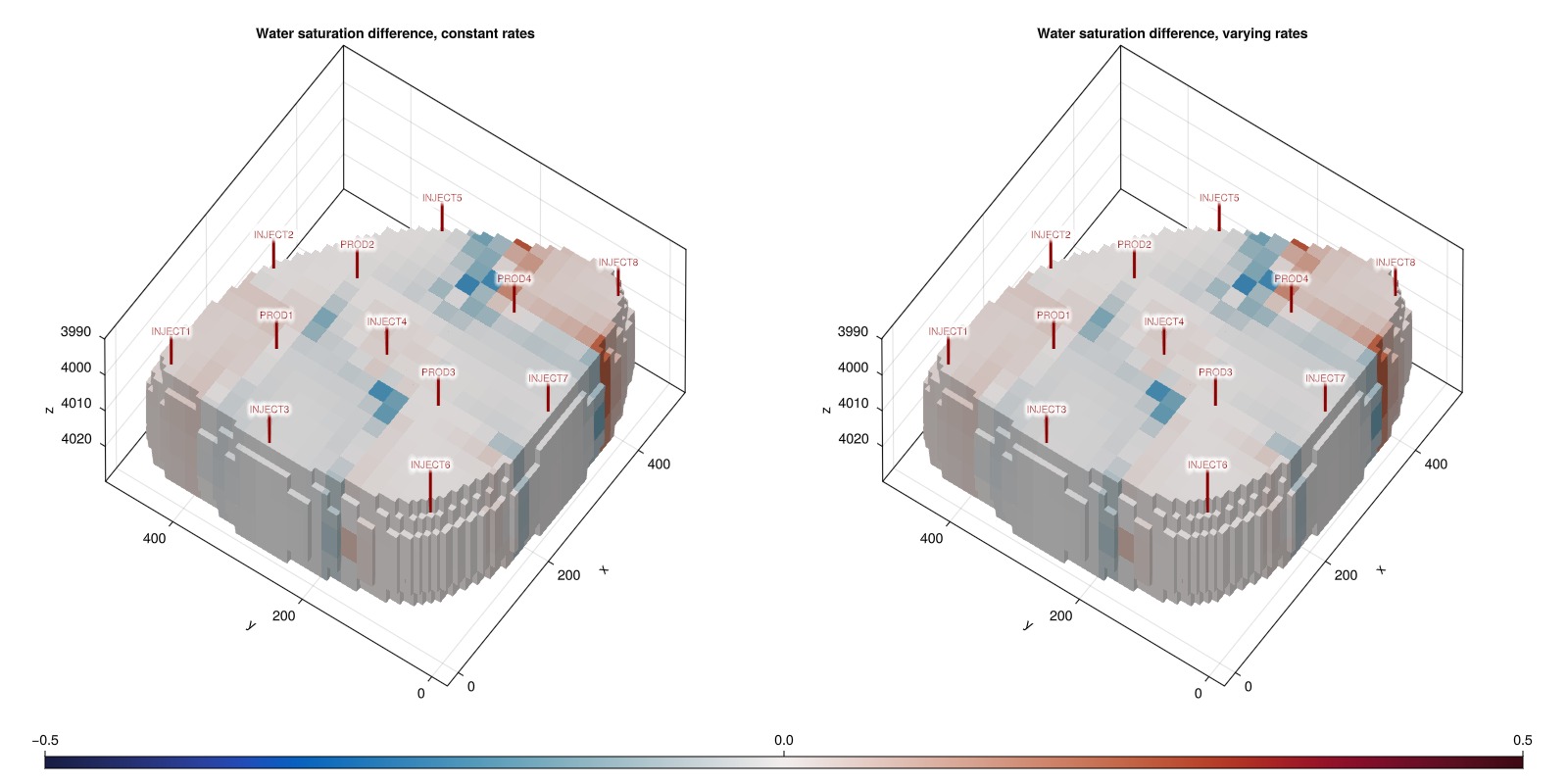 ax = Axis3(fig[1, 2], zreversed = true, title = "Water saturation difference, varying rates")