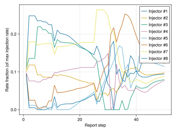ax = Axis(fig[1, 1], xlabel = "Report step", ylabel = "Rate fraction (of max injection rate)")