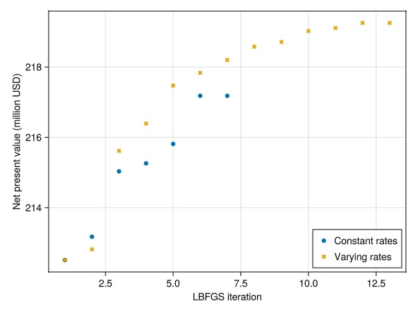 ax = Axis(fig[1, 1], xlabel = "LBFGS iteration", ylabel = "Net present value (million USD)")