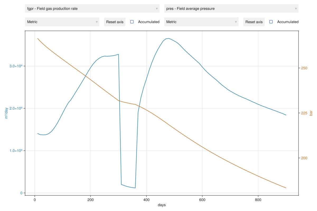 Similar to the wells, we can also plot field-wide measurables. We plot the field gas production rate and the average pressure as the initial selection. If you are running this case interactively you can select which measurables to plot.