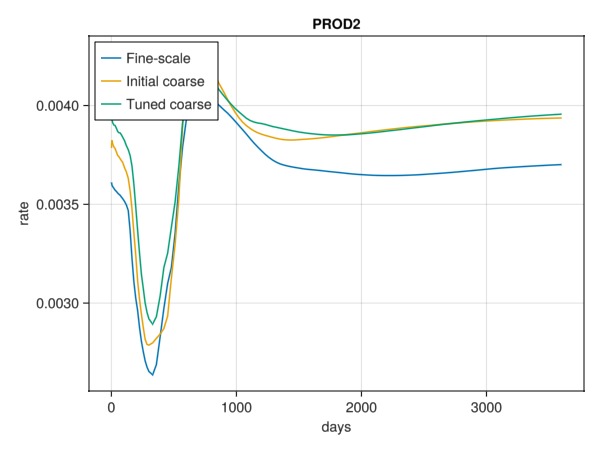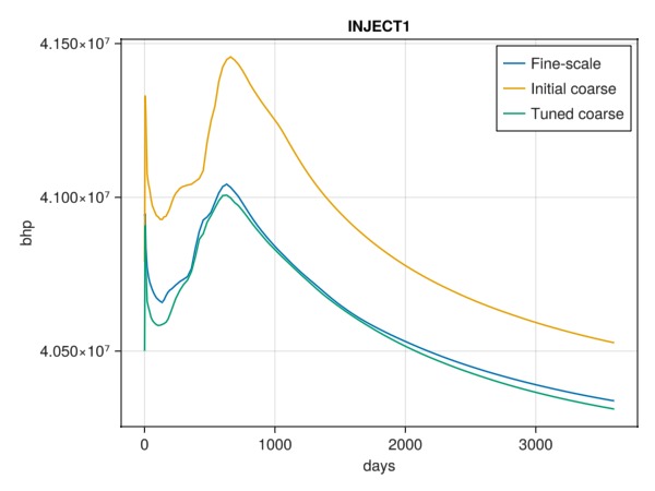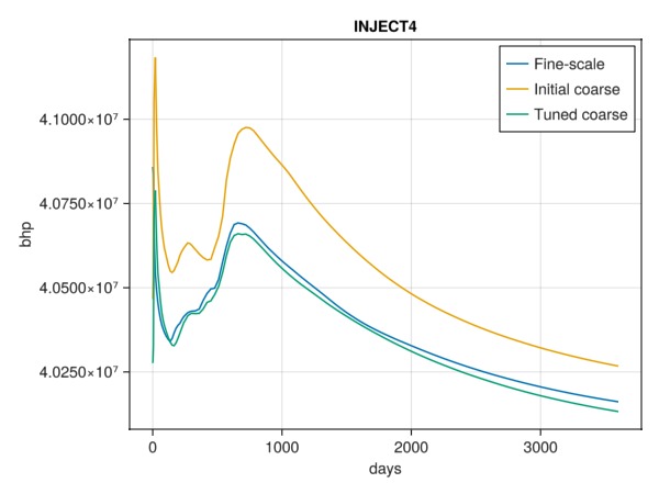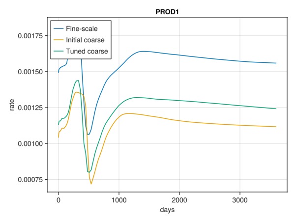 This example demonstrates how to calibrate a coarse model against results from a fine model. We do this by optimizing the parameters of the coarse model to match the well curves. This is a implementation of the method described in [10]. This also serves as a demonstration of how to use the simulator for history matching, as the fine model results can stand in for real field observations.