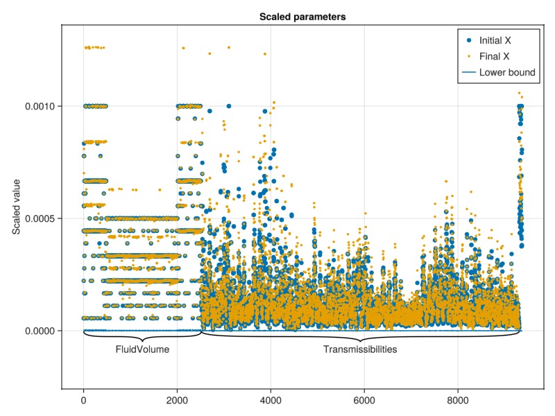JutulDarcy maps the parameters to a single vector for optimization with values that are approximately in the box limit range (0, 1). This is convenient for optimizers, but can also be useful when plotting the parameters, even if the units are not preserved in this visualization, only the magnitude.