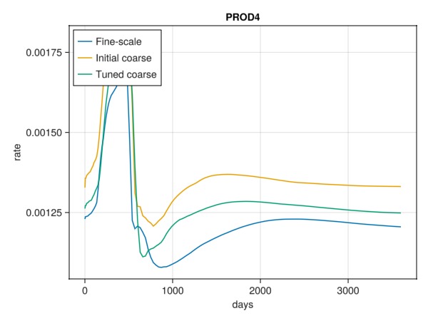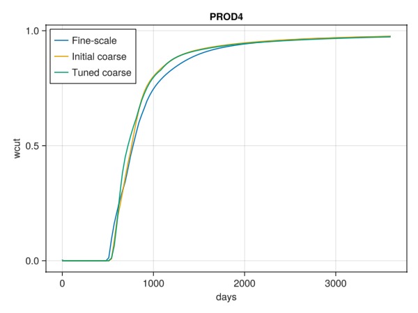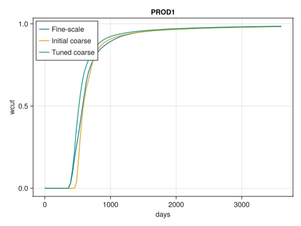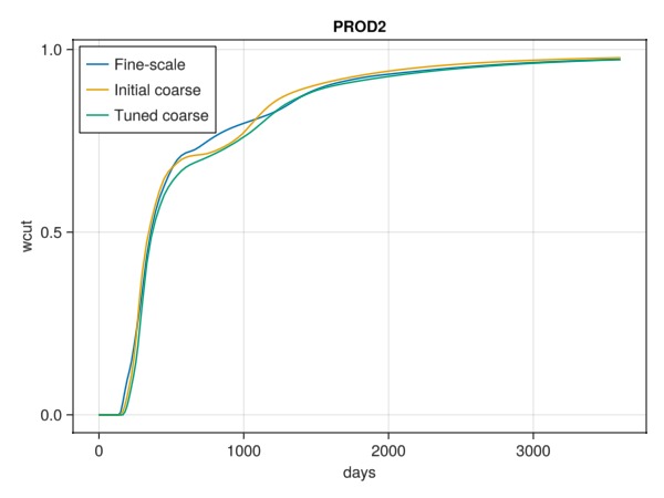 We next compare individual wells to see how the optimization has affected the match between the coarse scale and fine scale. As we can see, we have reasonably good match between the original model with about 18,000 cells and the coarse model with about 3000 cells. Even better match could be possible by adding more coarse blocks, or also optimizing for example the relative permeability parameters for the coarse model.