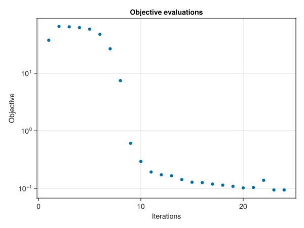 ax1 = Axis(fig[1, 1], yscale = ys, title = "Objective evaluations", xlabel = "Iterations", ylabel = "Objective")