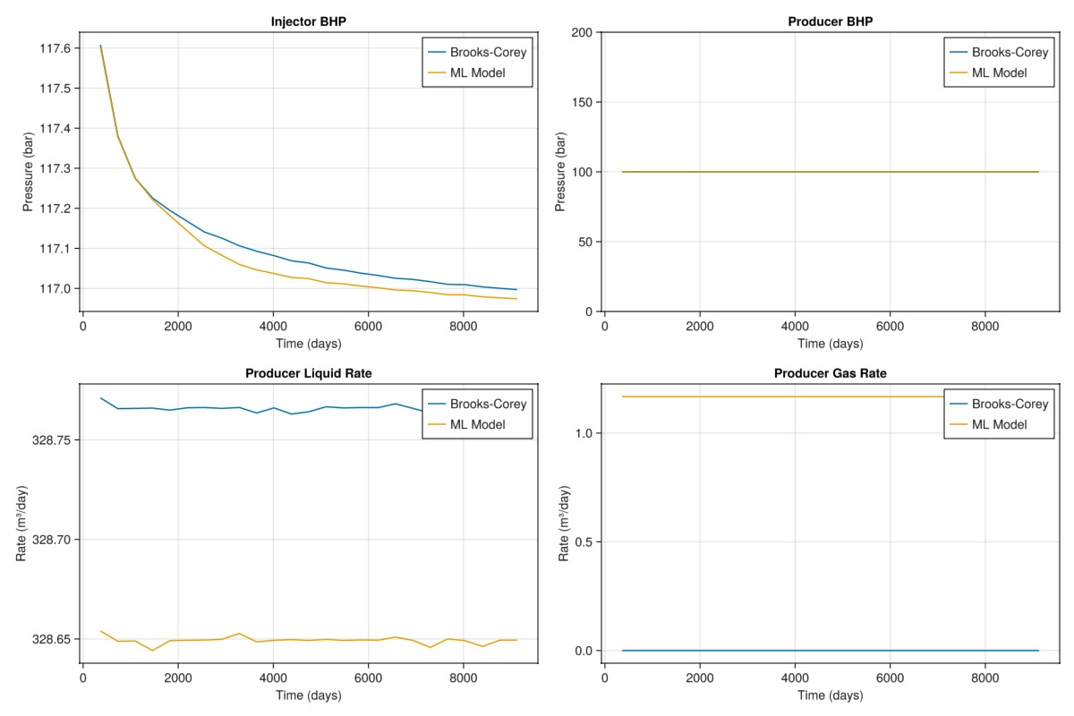 This example demonstrates how to integrate a neural network model for relative permeability into a reservoir simulation using JutulDarcy.jl. While we used a simple Brooks-Corey model for demonstration, this approach can be extended to more complex scenarios where analytical models may not be sufficient.