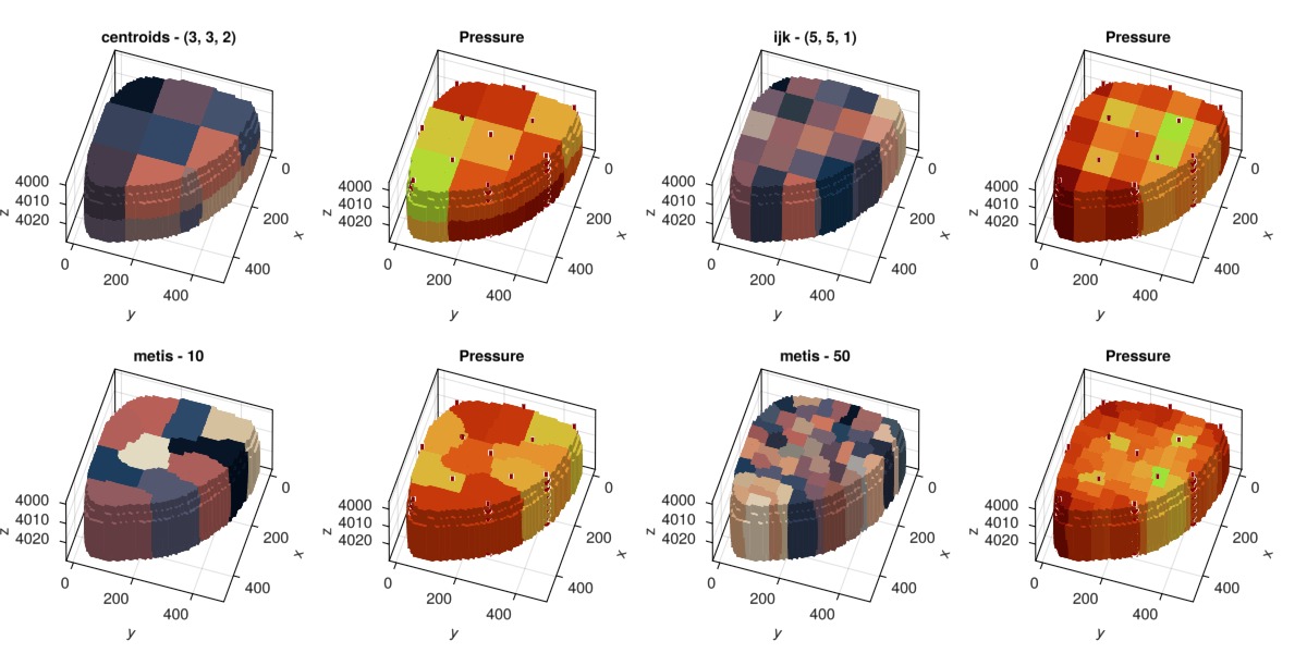 We have only so far tested a single partitioning method. We can quickly generate a few other coarse models using different partitioning methods and coarsening values. We highlight that we can also use the centroids instead of the IJK indices to partition, for when the mesh may not have a structured background mesh. In addition, we can call different graph partitioners by passing the desired number of blocks. Here, we call a simple METIS-based transmissibility coarsening, but the code contains options to use other weights and partitioners.