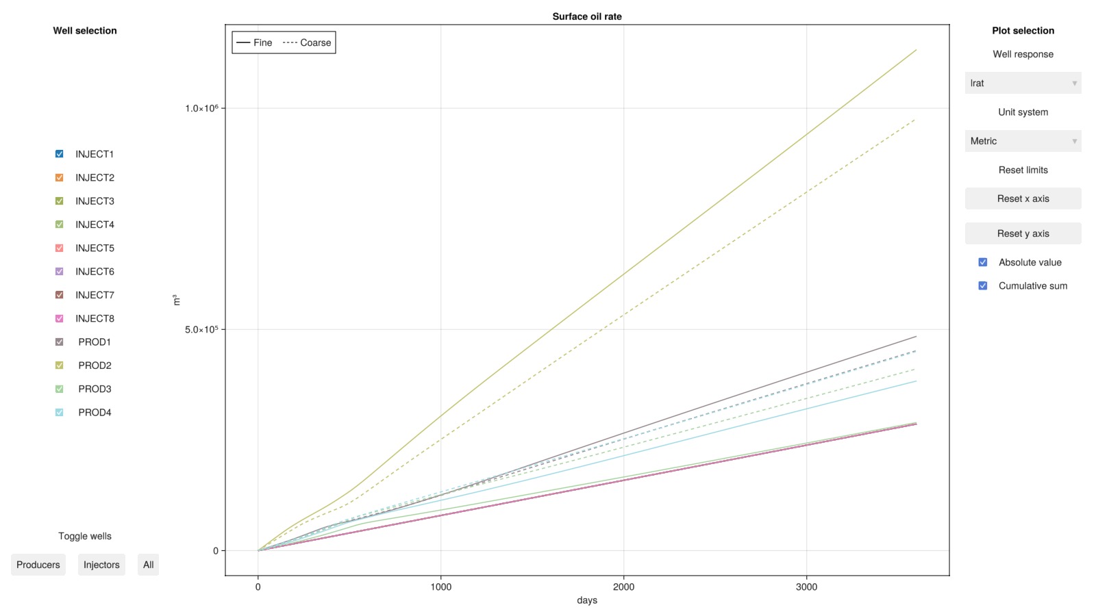 plot_well_results([ws, ws_c], names = ["Fine", "Coarse"], field = :orat, accumulated = true)
