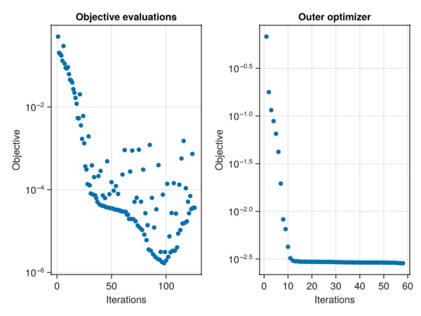 ax2 = Axis(fig[1, 2], yscale = log10, title = "Outer optimizer", xlabel = "Iterations", ylabel = "Objective")