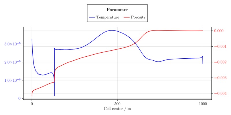 ax1 = Axis(fig[2, 1], yticklabelcolor = :blue, xlabel = "Cell center / m")