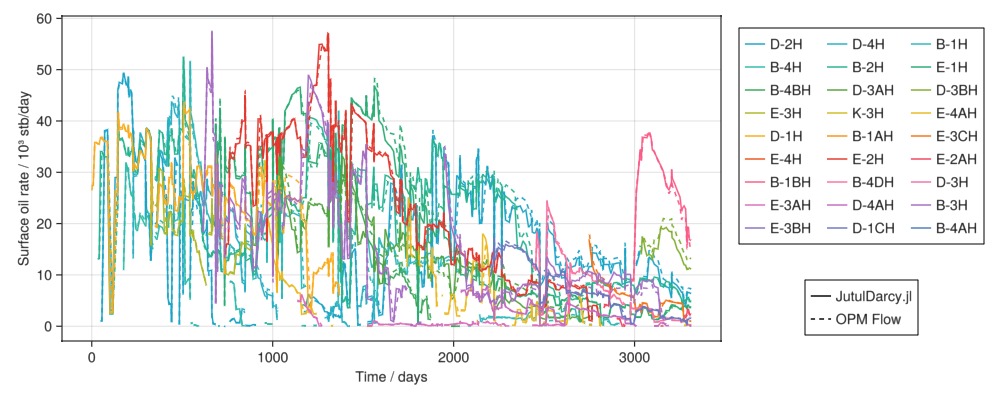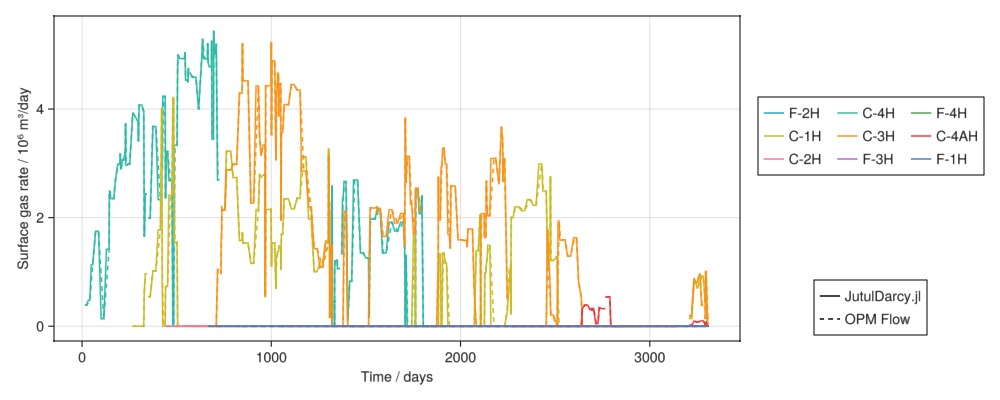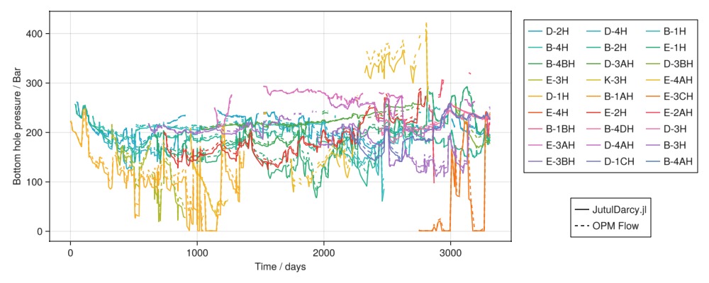 Legend(fig[4, 2], [l1, l2], ["JutulDarcy.jl", "OPM Flow"])