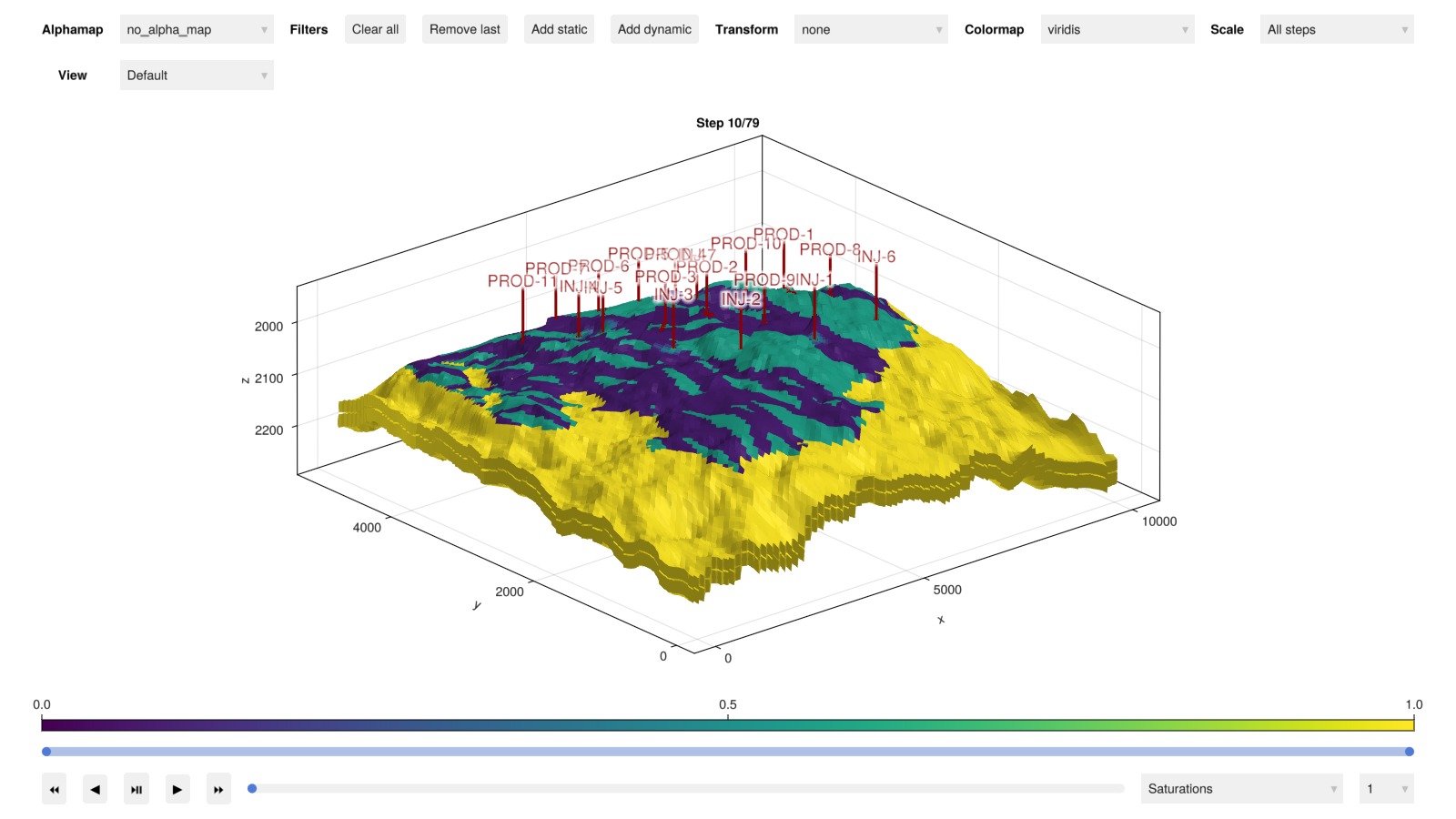 plot_reservoir(case.model, states, step = 10, key = :Saturations)