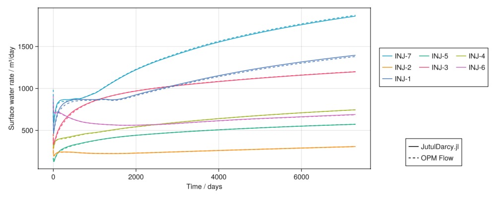 Legend(fig[4, 2], [l1, l2], ["JutulDarcy.jl", "OPM Flow"])